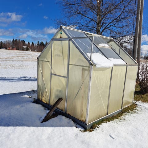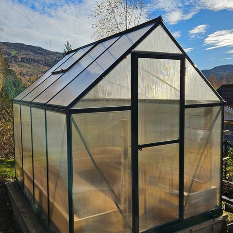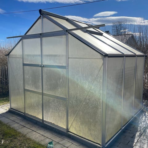 Drivhus i aluminium med plater i plast. Egnet for dyrking av grønnsaker, urter og prydplanter. Konstruksjonen har skråtak og sidevegger i transparente plater som slipper inn lys. Passer for plassering i hage eller på tomt med nok sollys. Det anbefales å feste drivhuset godt til underlaget og sørge for jevnlig vedlikehold av ramme og plater.