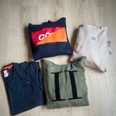 Supermyke Superdry herreklær pakke med 4 gensere og 1 shorts i størrelse S. Plaggene er i supermyk bomull 2 i ulike blåtoner, 1 grå og 1 lys grønn/lys turkis . Se bilder. flere langermede med rund hals og brystlogo, samt et par blå shorts med lommer og knappelukking. Passer til hverdagsbruk for menn som bruker størrelse S. Alle plaggene er i samme stil med typisk Superdry-detaljering og merkelapper. Veldig pent og svært lite brukt.