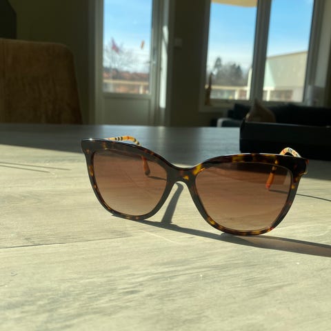 Michael Kors solbriller for dame med skilpaddemønstret plastinnfatning og mørke glass. Rammen har en myk, lett cateye-form. Tynne metallstenger med plasttupper gir lav vekt og komfortabel passform bak ørene. Modellen har klassisk fargekombinasjon som passer til variert bruk i hverdagen. Solbrillene er egnet for utendørsbruk og gir skjerming mot sterkt lys.