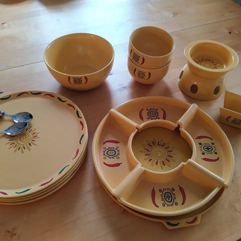 Sagaform tacosett i gul farge. Settet består av 13 mindre skåler, en mellomstor og en stor, et fat med plass til f.eks. dipp i midten og et til fat. Se bilder for mer eksakt størrelse. De har dekorativt motiv på utsiden. Egnet til servering av for eksempel taco, snacks, tilbehør og andre matretter ved borddekking og i hverdagsbruk.