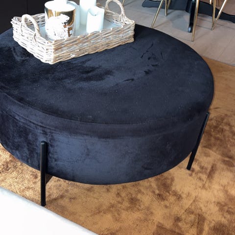 Stilren sort puff selges. Puffen er praktiske og kan brukes både som ekstra sitteplass, fotskammel eller som et lite sidebord med et brett på toppen. Den nøytrale sorte fargen gjør at de passer lett inn i de fleste hjem og interiørstiler.