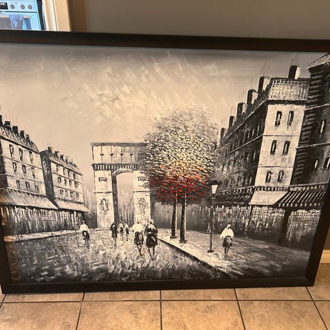 Innrammet maleri med bymotiv som viser bygårder, gateløp og mennesker som går langs fortauet. Bildet er malt i sterke farger med tydelige penselstrøk, og motivet inkluderer trær, gatelykt og blomsterbed. Maleriet er montert i en klassisk, profilert ramme. Passer som veggdekor i stue, gang eller andre oppholdsrom der man ønsker et figurativt og fargerikt bymotiv. L.109/H 86