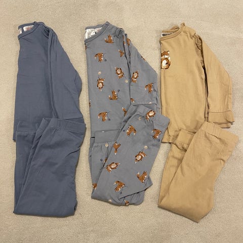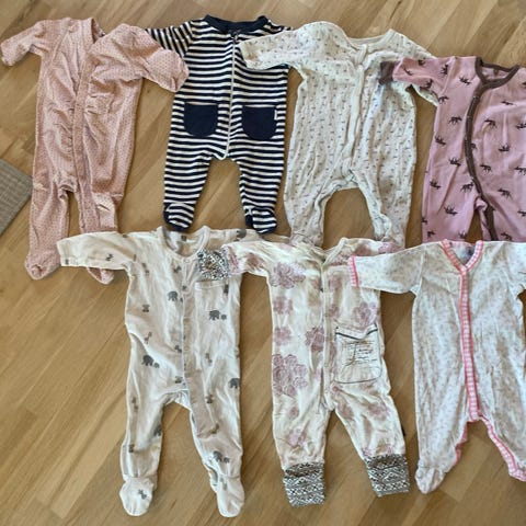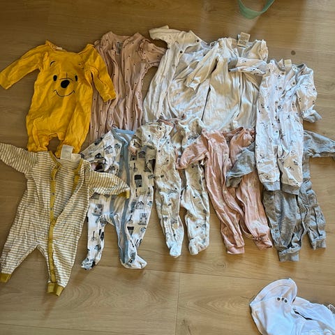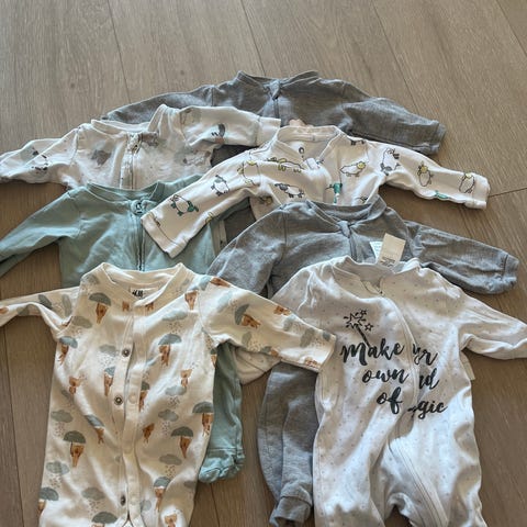 5 H&M og 1 Cubus pysjamas i bomull i størrelse 86. Fin stand, noe av det er svært lite brukt og noe er mer brukt, men alt ser fint ut. Ingen synlige flekker når jeg så raskt over det.