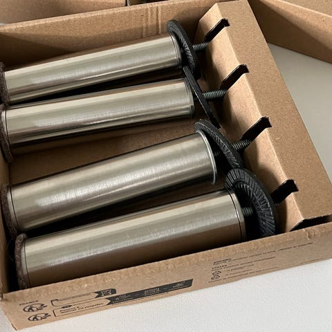 IKEA møbelben sett i metall med kromfarget overflate. Pakken inneholder fire ben som kan brukes til ulike typer møbler som skap, sofa, kommoder eller TV-benker. Benene har justerbare fester i toppen for montering i møbelets underside. Egnet når man ønsker å endre høyde eller utseende på møbler fra IKEA eller andre kompatible møbler.