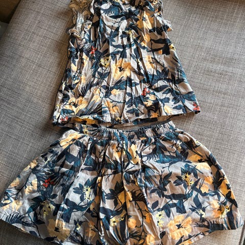Skjørtet er applikert med søte sommerfugler. Den kortermet toppen har tyll på ermene og sommerfugl på brystet. Den langermede toppen er i bomullsribb.