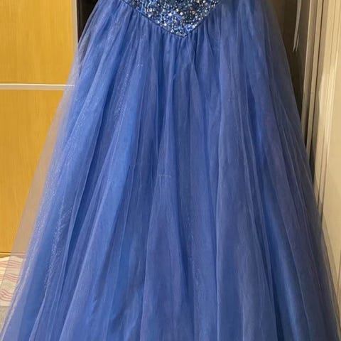 Lyseblå ballkjole med sølvfargede perler/paljetter.