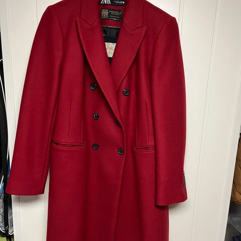 H&M kåpe for dame i størrelse 38. Kåpen er rød og laget i kasjmirblanding, med glatt fôr på innsiden. Den har knappelukking foran og lommer i sidene. Klassisk modell som passer til bruk over både hverdags- og penklær.