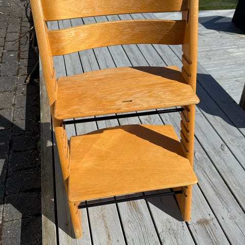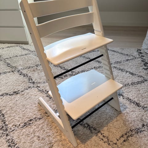 Sel ein original Tripp Trapp i god stand, med noko normale bruksmerker. Stolen er opphavleg i natur/trefarge, men er spraymåla kvit. Alle plater er heile og stolen er stabil og fullt funksjonell.