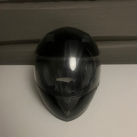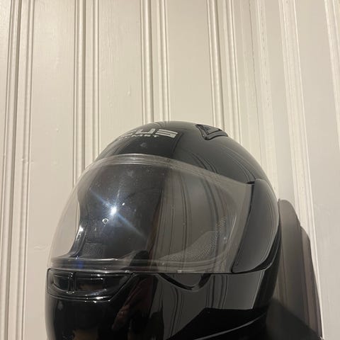 Hjelmen har en liten skade/sprekk på plasten ved den fremre ventilen (se bilde). Derfor selger jeg den billig. Hjelmen har ellers vært pent brukt. Jeg falt på den én gang, men ellers er det ingenting galt med den, den fungerer perfekt og det er mer en sommerhjelm fordi den ikke er så varm.