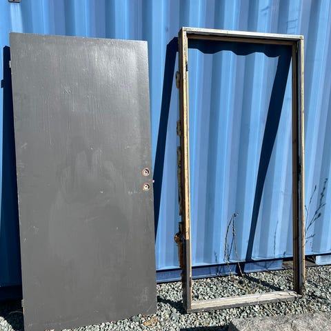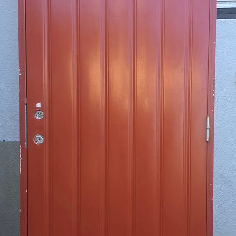 Vi har byttet ut ytterdøra vår og selger derfor den gamle. Den står demontert i garasjen vår. Skal være i grei stand etter demontering. Må hentes.
