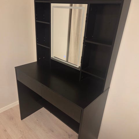 Speil med tilhørende skuffeseksjon i svart utførelse. Møbelet består av et stort rektangulært speil montert på en lav benk med to skuffer. Skuffene har lyse håndtak og gir oppbevaringsplass til mindre gjenstander. Passer for eksempel i gang, soverom eller garderobe som kombinert speil og oppbevaringsmøbel.