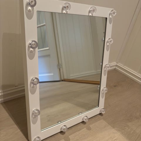 Sminke speil med oppbevaring og LED light. Speilet står på en liten base med kant som kan brukes til å legge fra seg småting som sminke, smykker eller annet tilbehør. Flere speilflater gir god oversikt ved bruk. Egner seg til bruk på bad, soverom eller sminkebord.