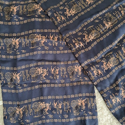 Selger et pent Tyrihans bunadskjerf med klassisk norsk mønster i rødt, gull og grønt på mørk blå bakgrunn.