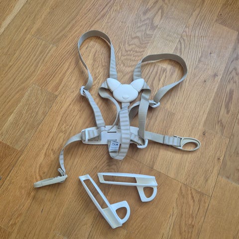 Stokke Tripp Trapp sele til barnestol i beige. Selen består av justerbare stropper og plastfester som monteres på Tripp Trapp-stolen. Den er utformet for å holde barnet stabilt i stolen under måltider og annen bruk. Passer til Stokke Tripp Trapp med kompatibelt feste- og sikkershetssystem. Selen kan justeres etter barnets størrelse og tas av for rengjøring etter behov.