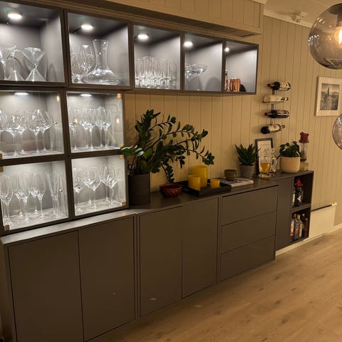 Montert lys i glasskapene.