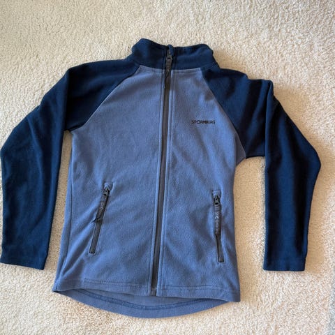 Grå ullzip m/blå detaljer og lomme på ve brystside og ziphals. Str S unisex. Brukt noen få ggr