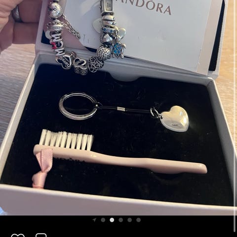 Armbåndet er i sølv og kommer med 9 vakre, originale charms fra Apart (polsk merke)i ulike design (blå glass, stener og sølvdetaljer). Smykket er brukt, men i veldig god stand uten synlige eller større bruksmerker.