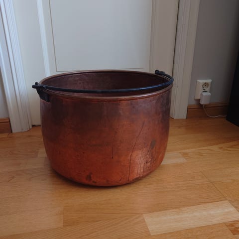Stor kobberdunk med lokk og håndtak. Flott patina og tung, solid kvalitet. Kan brukes som dekor, veddunk, oppbevaring eller som et samlerobjekt. God stand.
