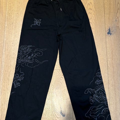 Gymshark X Power Frazetta var en serie med klær gymshark lanserte i starten av Januar 2026. Buksen ble utsolgt på rundt 1 time etter lansering, og eg var heldig som fikk en. Den er STRL M. Eg er da 182 CM høy og som du ser er den både litt for lang og alt for bre for meg. Den er helt ny, lappen henger på buksen og har aldri blitt brukt. Kjøpte den for 1200KR. Vil ha rundt 1000. Kom gjerne med bud😊