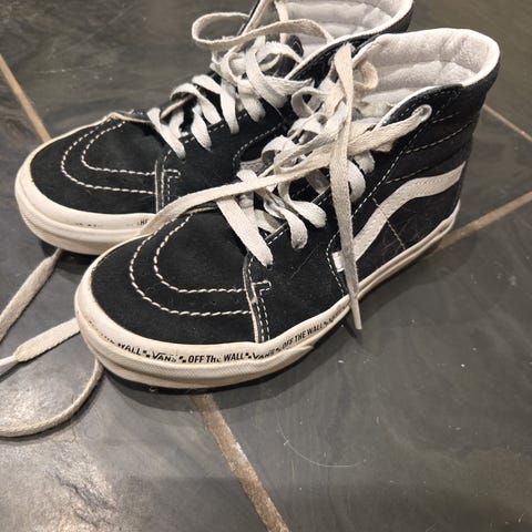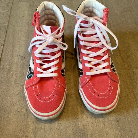 Vans høye sneakers for barn/unisex i størrelse 37. Skoene har rød og svart overdel med rutete detalj langs siden og hvite lisser. Klassisk Vans-såle i hvitt med rød hældetalj. Passer til hverdagsbruk og fritidsaktiviteter.