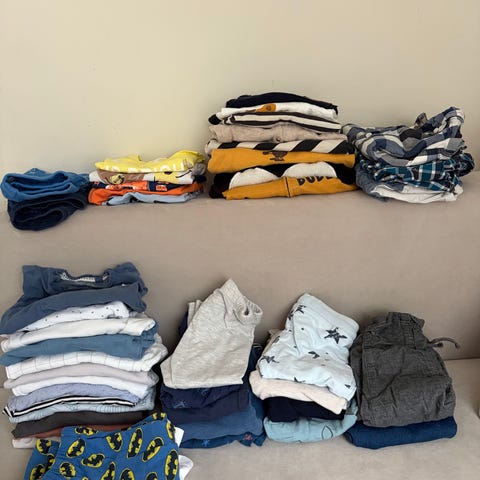 ~ Klærne er merket med størrelse 134, 140 og 146. Men alt er brukt samtidig. Det siste bilde illustrerer 3 bukser merket med forskjellige størrelser, men de er like lange.