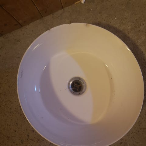 - Skade 2: Hakk/sprekk helt øverst på innsiden av den ene langsiden. Dette har ingen funksjonell betydning da hakket er høyere opp enn overløpshullet, så det vil ikke dryppe vann ut. Bør dekkes over med silikon e.l. for å unngå en skarp kant i badekaret.