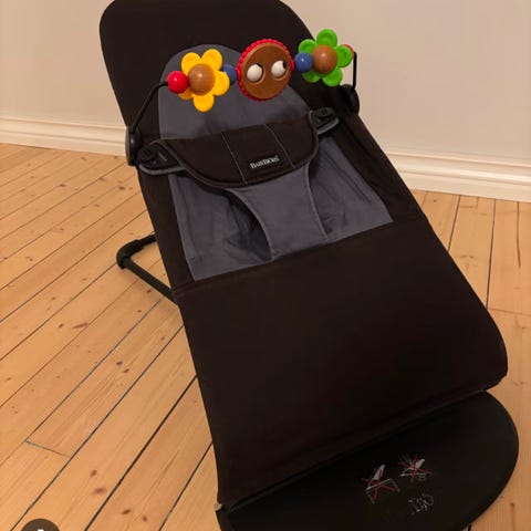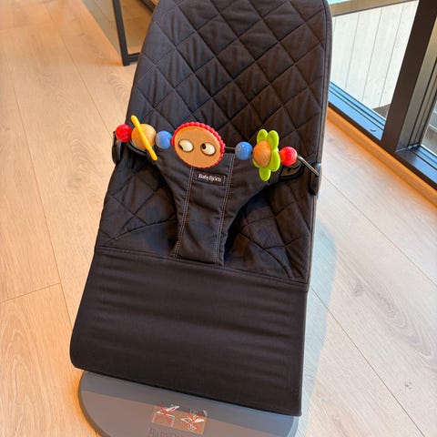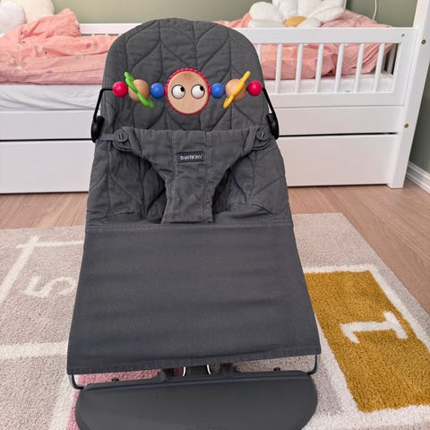 Babybjörn vippestol i grå farge. Stolen har polstret, vattert sete med rutemønster og integrert sele for barnet. Stolen kan justeres i flere posisjoner fra mer oppreist til mer tilbakelent.