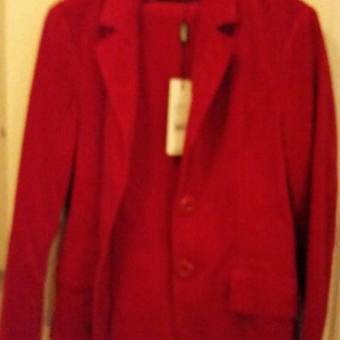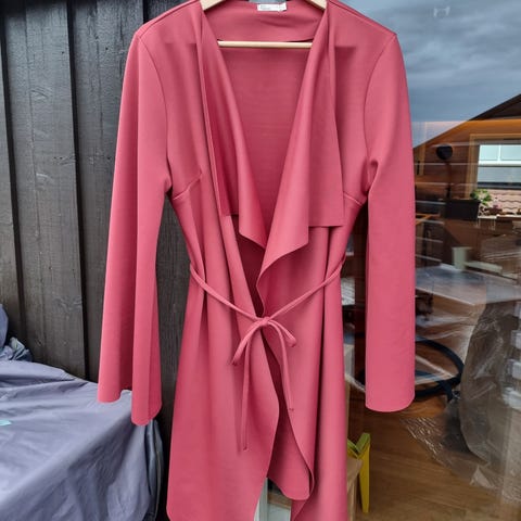 Damesett: jakke + bluse + bukser. for dame i størrelse L og XXL. Modellen har et åpent snitt uten synlig lukking i front og rekker omtrent til over kneet, avhengig av høyde. Ermene er lange og kan brettes opp. Plagget passer til vår eller sommer.