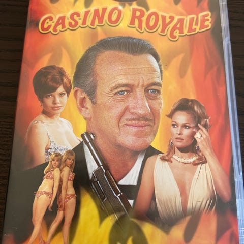 Spillefilm i DVD-format. Omslaget viser originalt filmcover for Casino Royale. Egnet for avspilling på DVD-spillere som støtter standard DVD-plater.
