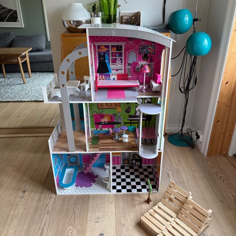 Barbie dukkehus med flere rom i rosa og lyse farger. Huset er i flere etasjer med ulike rom som kjøkken, stue, bad og soverom. Det har detaljer som dører, vinduer, møbler og tilbehør som kan flyttes rundt for ulike oppsett. Øverste etasje har bad med dusj som kan gjøres om til spa-område. Dukkehuset er tilpasset Barbie-dukker i standardstørrelse. Dukker følger ikke med.