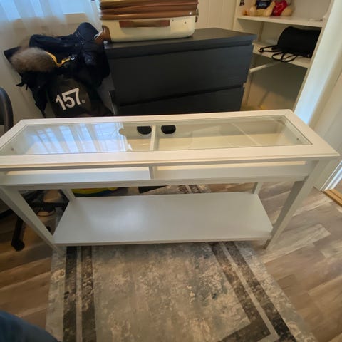 Konsollbord i sort glassplate og krom metallben. Det er ei ripe i glassplaten de bilde.