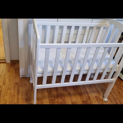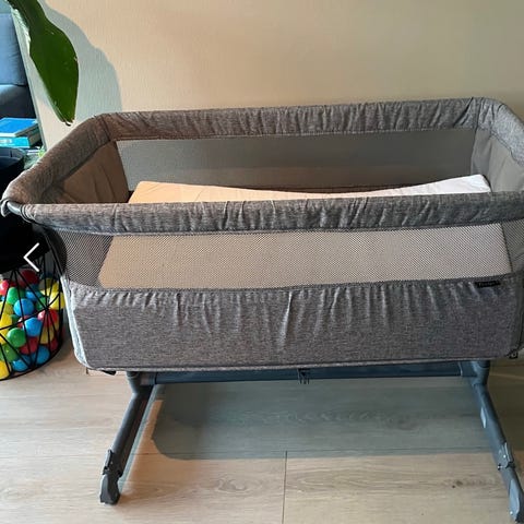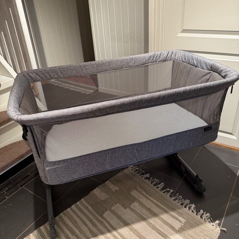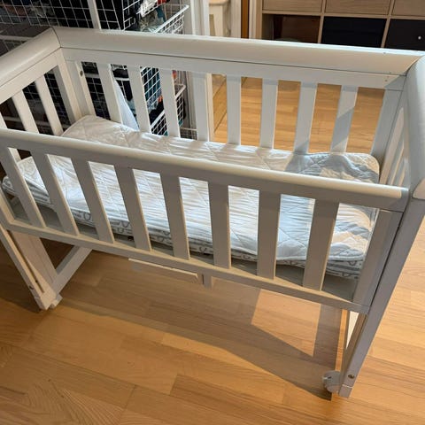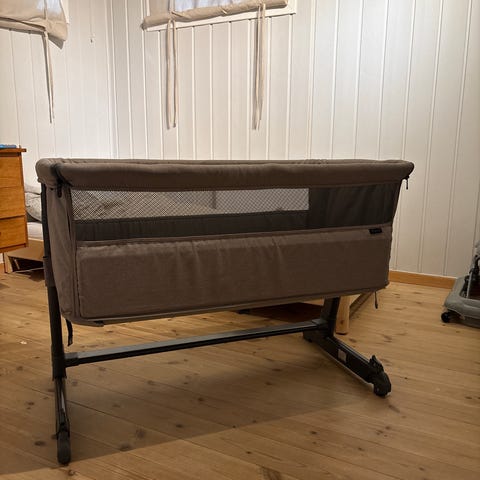 Selger denne bedside criben fra Yngri. Vi kjøpte den selv på Finn for noen dager siden av et par som anskaffet den i 2025, men barnet samsov med mor så den ble knapt brukt.