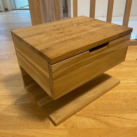 OLDERDALEN nattbord er inspirert av tradisjonelt skandinavisk håndverk. Den sjenerøse formen støtter dine kveldsritualer – fra lading av telefonen til et sted å ha bøker og blader.