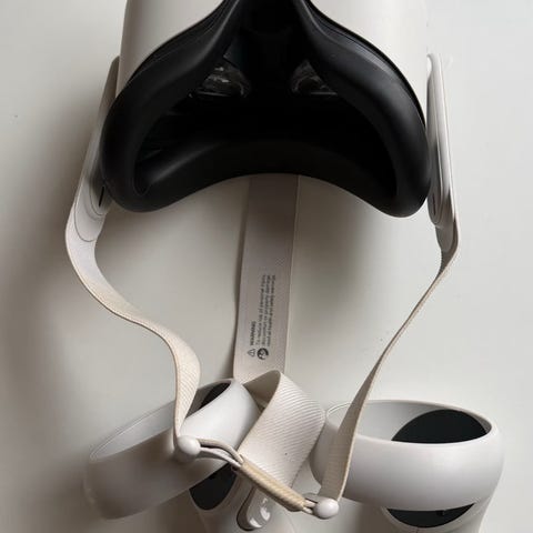 Meta Oculus Quest 2 VR-headset i hvit farge. Trådløst virtual reality-headset med justerbar hodestropp og integrerte linser. Settet inkluderer to håndkontrollere som brukes til navigasjon og interaksjon i VR-miljøer. Egnet for bruk til spill, apper og andre VR-opplevelser som støtter Oculus Quest 2-plattformen.