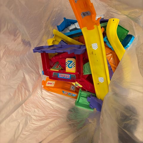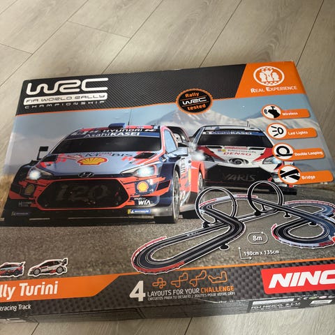 Gøy bilbane - bare en av kontrollene virker. Noen slitte deler. Jeg har ikke prøvd å fikse den andre kontrollen, så vet ikke om det går.