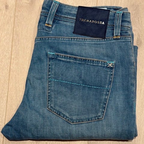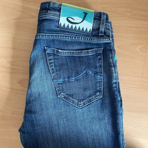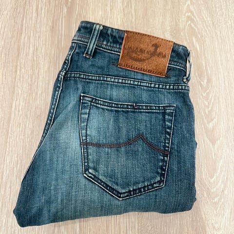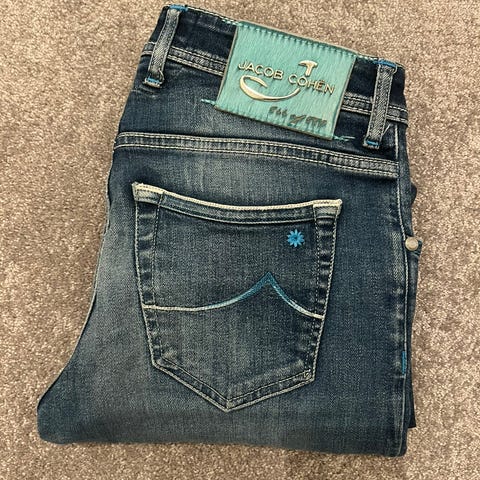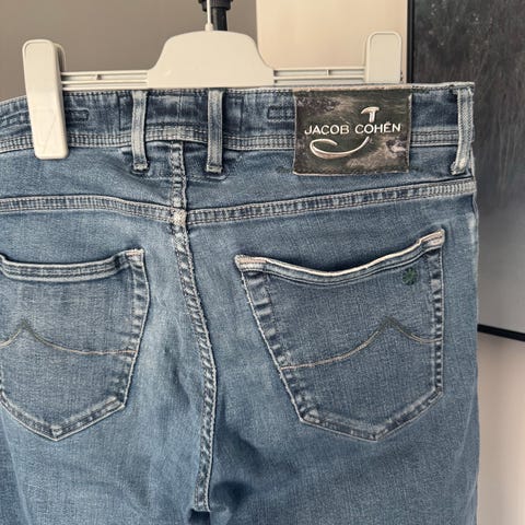 Jacob Cohën jeans for herre i blå denim av bomull. Buksen har livvidde W34 og er merket størrelse M. Klassisk femlommersmodell med knappelukking i gylfen og karakteristiske kontrastsømmer. Innvendig detaljer med mønstret fôr og merkede lapper. Egnet som hverdagsbukse eller til mer pyntede anledninger avhengig av styling.