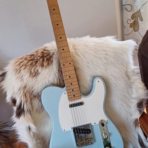 Selger en Fender Vintera ‘50s Telecaster i Sonic Blue med maple hals. Gitaren er fra 2021 og fremstår som svært lite brukt.