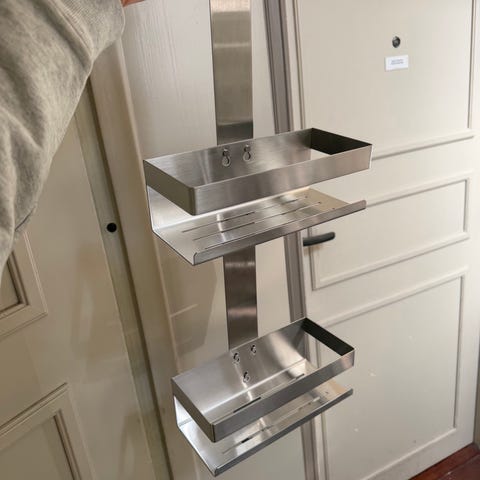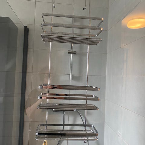 Hylle i kromfarget metall med flere nivåer for oppbevaring av såpe, sjampo og annet baderomsutstyr. Leveres med tilhørende festeskruer og dekklokk for montering på vegg. Egnet for bruk i dusj eller på bad der det er behov for ekstra oppbevaringsplass i hjørnet.