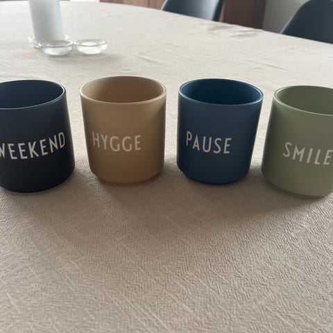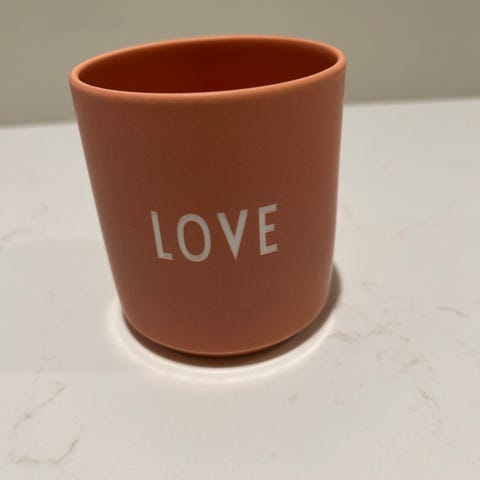 Ubrukt kopp fra Design Letters i rosa med teksten "mom" og "love"