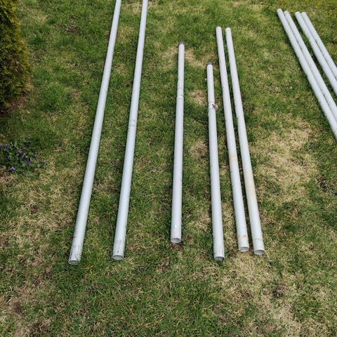 7,5 meter stativ: 1 Møne 7,5m (5 x 1,5m), 1 Lang støtte (150cm til 290cm), 2 Korte støtter (80cm til 150cm), 4 Ben av 3m (2 x 1,5m)