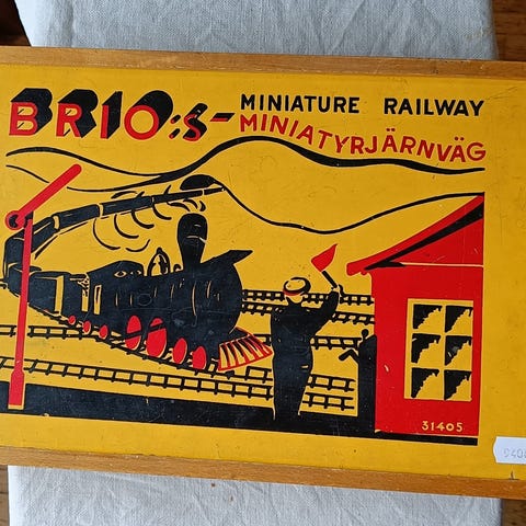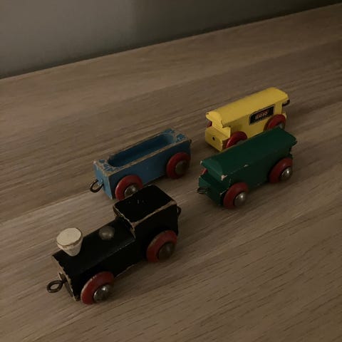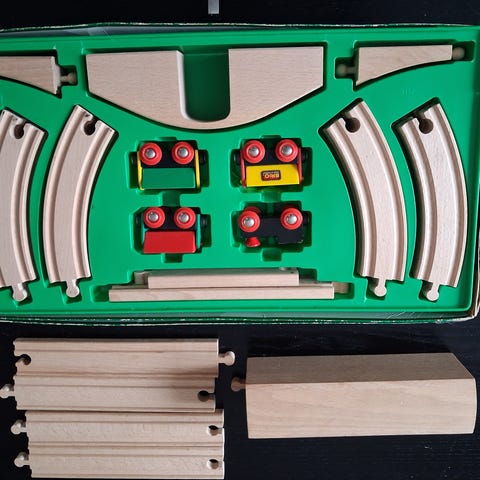 Brio tog med vogner, skinner og tilbehør i tre. Sett med lokomotiv og flere vogner med røde hjul, rette treskinner og ulike treklosser i flere farger. Passer som klassisk treleke for barn til lek på gulv eller bord. Toget og skinnene er laget i lyst treverk med enkelte deler i malt tre.