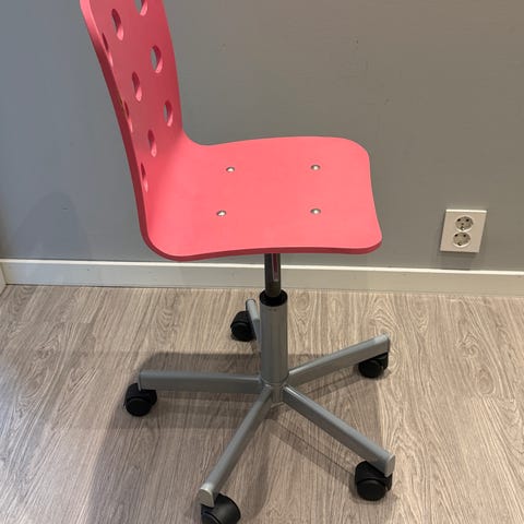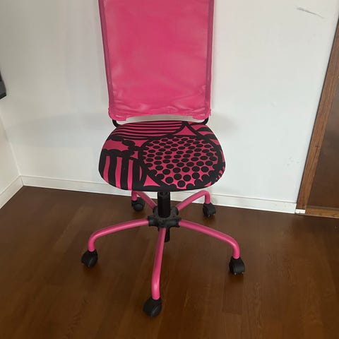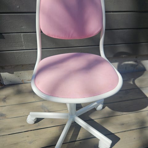 Liten skrivebordsstol med polstret sete og rygg i rosa tekstil. Selges halv pris ordinær. Så god som ny ikke synlige merker. Vaskbart trekk. Stolen har hvitt understell med fem hjul som gir enkel forflytning.