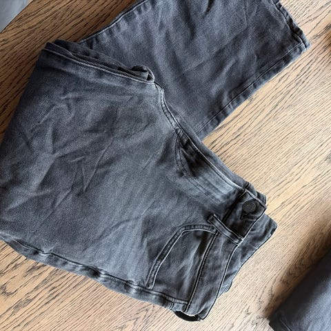 Klassisk 5-lommers modell i denim med glidelås og knapp i front.