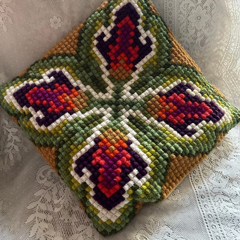 To stk gamle broderte sofaputer, 31 x 31 cm, selges samlet. Kan sendes for 70 kr.