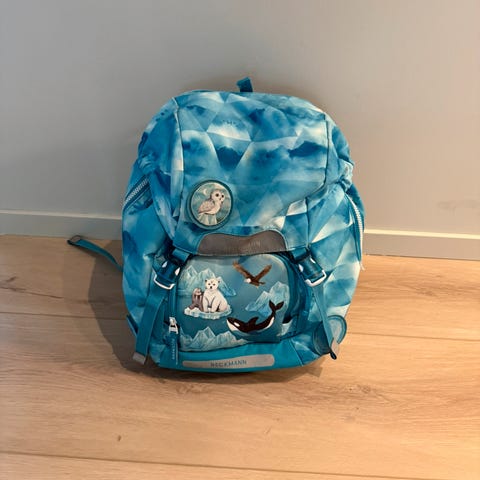Pent brukt beckmann skolesekk. Passer fra 1-4klasse. Integrert regntrekk og en liten sekk/etui med utskiftbare borrelås merker. Hel og fin, noe flekker/merker kan forekomme men ikke så synlig.