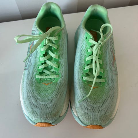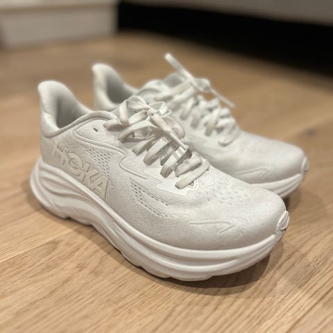 Hoka løpesko i størrelse 39,5. Skoene har overdel i grått tekstil og syntetisk materiale med snøring foran. Mellomsålen er kraftig og hvit, med dempende sålekonstruksjon som gir støtte ved gange og løping. Yttersålen er laget i slitesterk gummi for godt grep. Passer til bruk på asfalt og andre faste underlag.