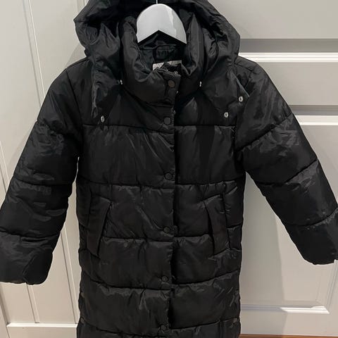 Lang vinterjakke fra H&M i størrelse 92 selges for 200,- kroner.. Jakken er svart farge, lang modell, så varmer godt. Fin som en kåpe til pent eller hverdags.