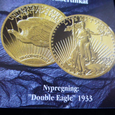 USA Saint-Gaudens 20 dollar gullmynt. Forsiden viser en stående frihetsfigur med stråler i bakgrunnen, mens baksiden har en ørn i flukt med soloppgang. Påskriften «United States of America» og «Twenty Dollars» er synlig. Mynten leveres i plastkapsel som vist på bildene. Nøyaktig årstall, vekt og gullinnhold er ikke spesifisert i annonsen og bør eventuelt kontrolleres av kjøper.