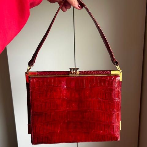 Vintage Dameveske i lær strutsehud, i en oransje farge. Vesken har topphåndtak og avtakbar skulderrem med metallspenne. Lukking med klaff og metallbeslag i front. Sidepartier og kanter er forsterket, og vesken har strukturert overflate. Passer som håndveske eller liten skulderveske til hverdagsbruk eller mer formelle anledninger.