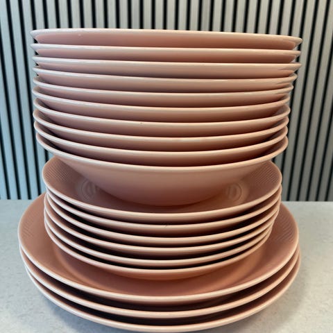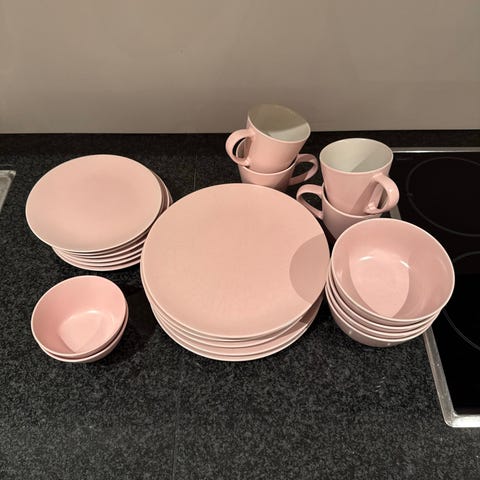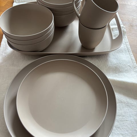 12-delt Modern House Outdoor Plant Based PLA kjøkkenservise (4 tallerkener, 4 skåler, 4 krus). Lett i vekt, men samtidig robust og holdbart. Ble kjøpt for å brukes på teltturer, men har ikke blitt av.